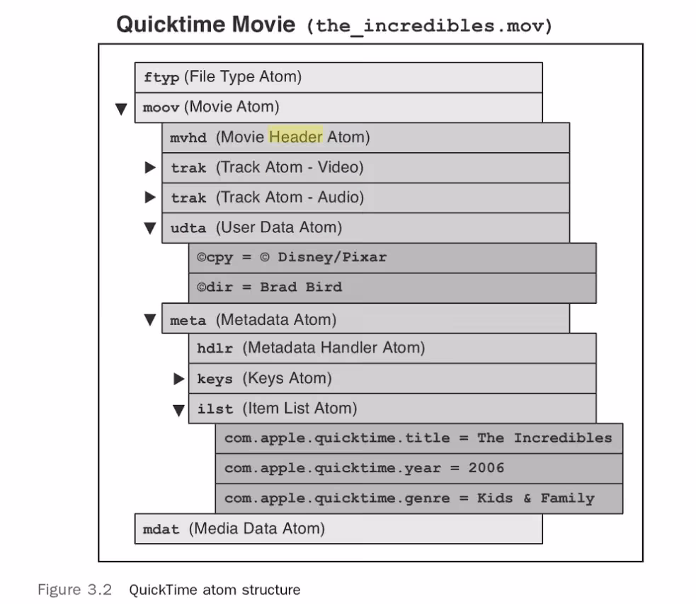 MPEG-4 atom结构 实测结果MPEG-4文件的元数据保存在/moov/udat/meta/ilst中. 对于atom中使用key没有标准, 大家都墨守成规的遵循苹果尚未发布的iTunes元数据规范中对key的定义. 虽然没有正式的发布,但iTunes元数据格式的相关文档已经在网上广为人知了(我就很纳闷 这算是发了版本还是没发,发了怎么还是尚未公布,没发怎么又广为人知…). 可以参考mp4v2库文档了解更多mp4内容.mp4是对MPEG-4媒体的标准扩展.eg:.m4v、.m4a、.m4p、.m4b.这些变体使用的都是MPEG-4容器格式,也有些包含了附加的扩展功能.