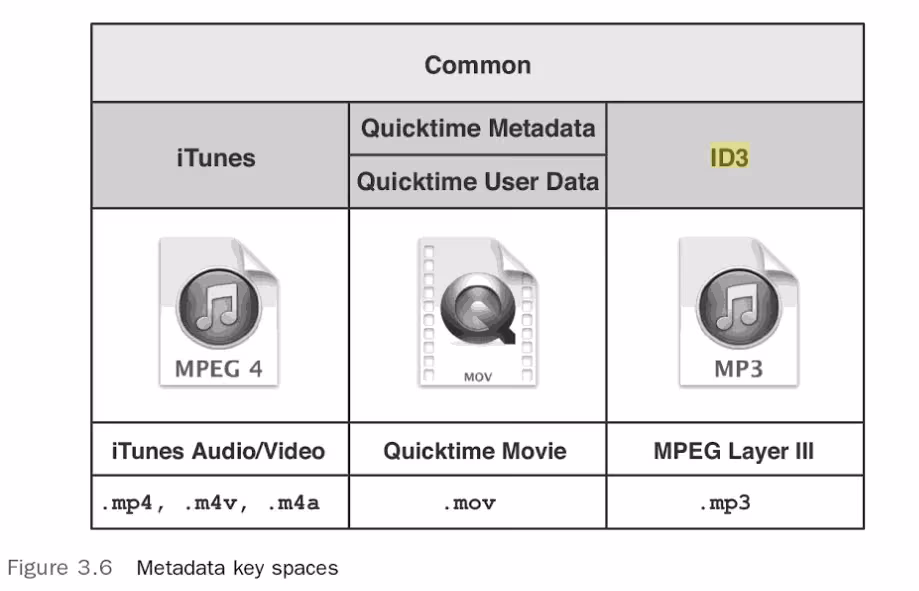 AV Foundation支持所有ID3v2标签格式的读取操作,但是ID3v2是要加星号的.ID3v2.2的布局和ID3v2.3及之后版本的布局不同. 需要注意:有些标签由3个字符组成,而不是4个字符, 比如一首歌曲的标注信息, 当标签为ID3v2.2时,是被保存到COM帧中,但当同一首歌使用ID3v2.3标签或更新版本的标签时,歌曲的标注信息会被保存在COMM帧中,框架定义的字符常量只适用于ID3v2.3及以后版本,后续demo中我们通过代码演示如何向前兼容ID3v2.2.