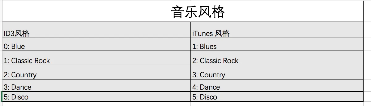 数字音频使用的标准风格最初来自 MP3. ID3 规范定义了80个默认的风格类型及 另外46个 WinAmp 扩展,共计 126个风格. 不过这些都不属于正式格式. 由于 mp3风格的主导地位比较明显, iTunes 没有另造轮子,而是基本遵循 ID3 的风格分类,不过做了点小变化。iTunes 音乐风格的标号比响应的 ID3标识符大 1 .