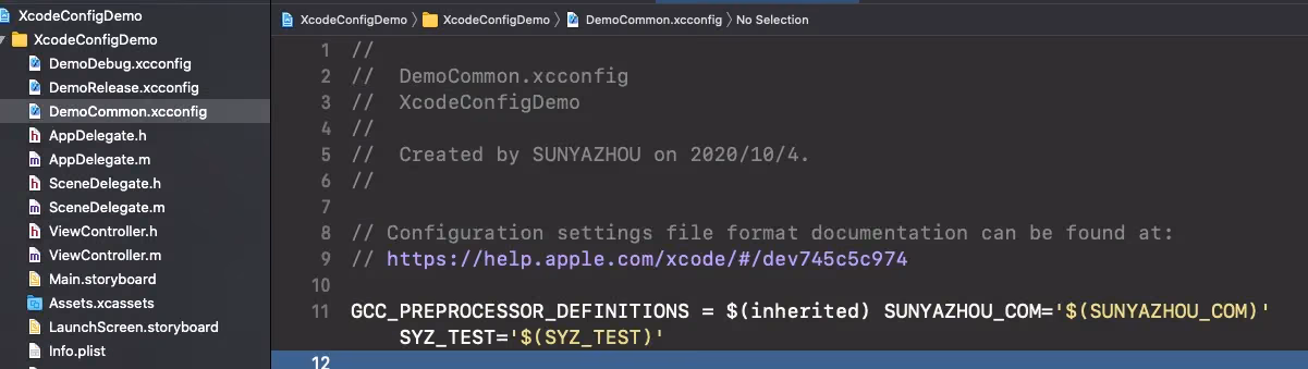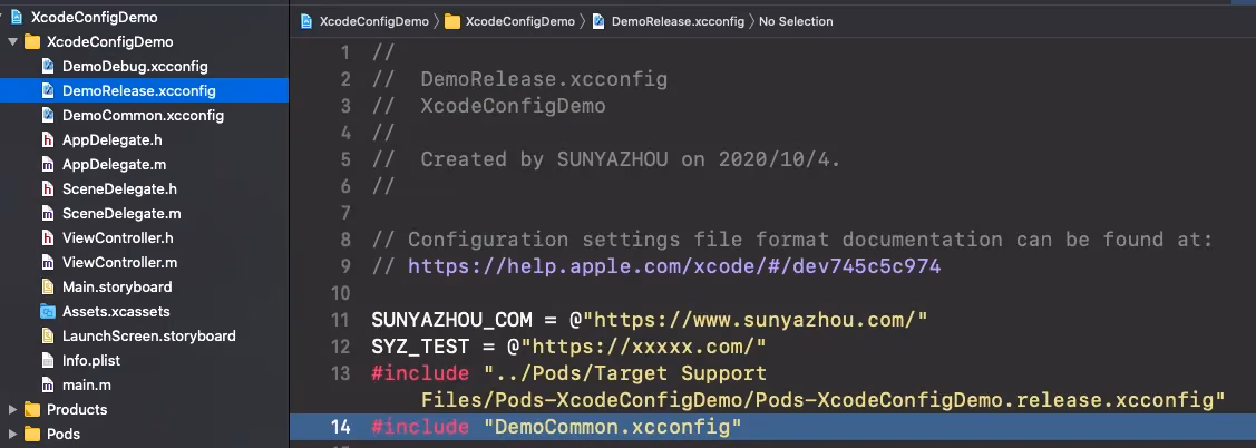 这里我加了一个通用的 DemoCommon.xcconfig 配置,为了向外输出公共的宏变量.