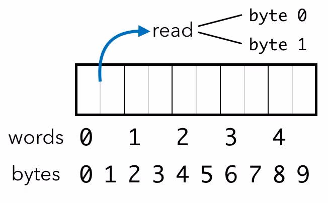 然后你升级到了一台 16 位计算机,它以 16 位的字(word)为单位访问数据。你仍然有一些旧的软件希望以字节为单位访问数据,但想象一下这里可能发生的魔法:如果软件请求字节 0 和字节 1,计算机现在可以一次性访问字 0,然后将 16 位的结果拆分。