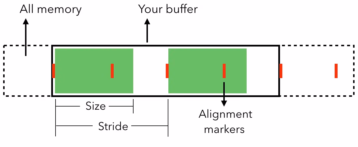 - 对齐方式(Alignment):是每个实例必须位于的“能被整除的”数字。如果你正在分配内存以复制数据,你需要指定正确的对齐方式(例如: