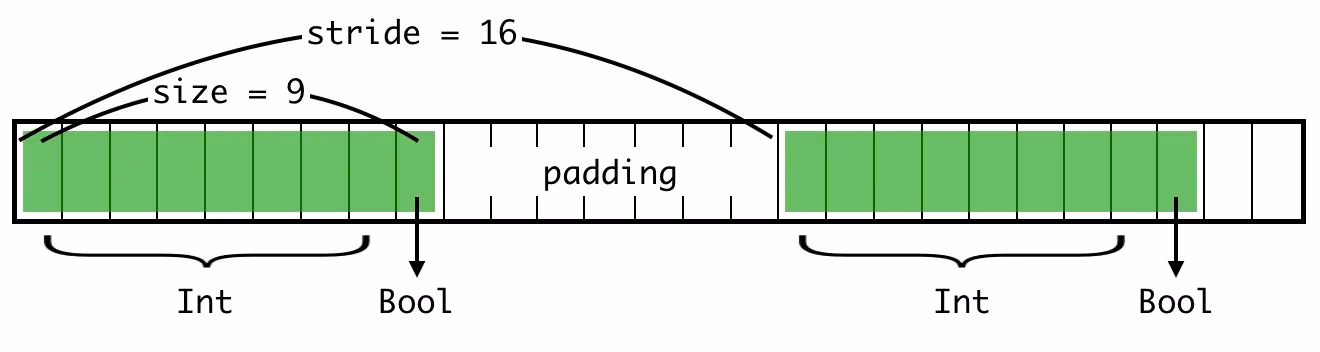 在内存中处理 Swift 类型时,需要考虑三个属性:大小(Size)、步长(Stride) 和 对齐(Alignment)。