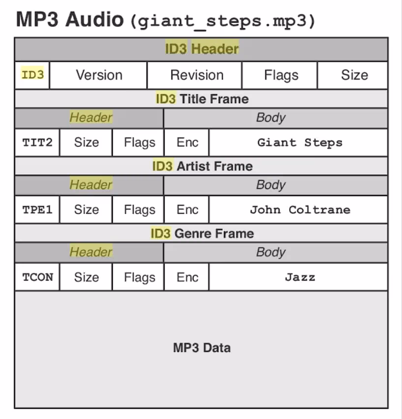 MP3文件和MPEG-4 (.mp4)、QuickTime(.mov)有显著区别,MP3不使用容器格式,而使用__编码音频数据__,文件开头通常包含可选元数据的结构块.mp3文件使用一种称为ID3v2的格式来保存关于音频内容的描述信息,包含: artist(艺术家)、演唱者、album(所属专辑)、音乐风格等.