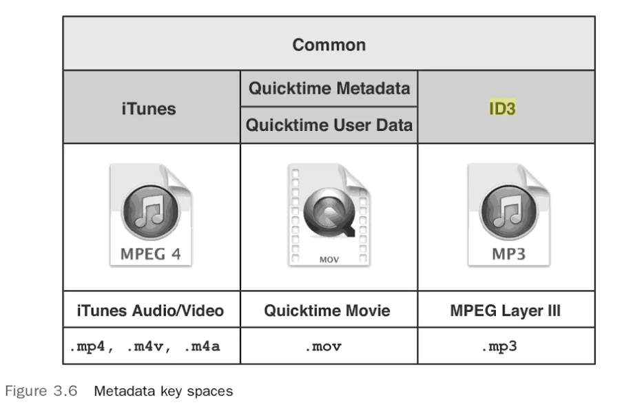 读取具体资源元数据的接口可以使用AVMetadataItem类提供的方法访问QuickTime、MPEG-4 atom和ID3帧中的元数据进行访问. AVAsset和AVAssetTrack提供了两种方法可以获取相关元数据.但是有各自的适用范围.了解适用范围之前首先要知道 键空间(key space)的含义. AV Foundation使用__键空间(key space)__作为将相关键组合在一起的方法, 可以实现对AVMetadataItem实例集合的筛选.每个资源至少包含两个键空间,以便从中获取元数据.