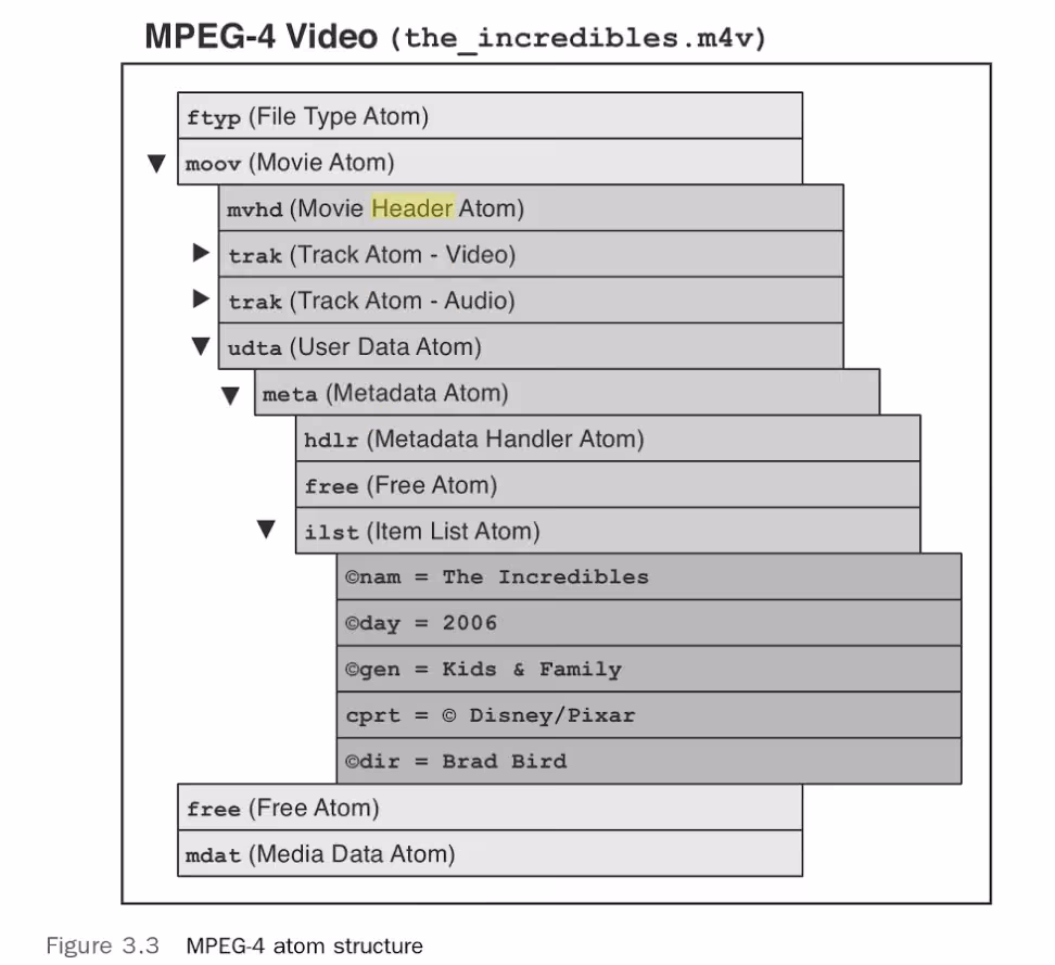 MPEG-4 atom结构 实测结果MPEG-4文件的元数据保存在/moov/udat/meta/ilst中. 对于atom中使用key没有标准, 大家都墨守成规的遵循苹果尚未发布的iTunes元数据规范中对key的定义. 虽然没有正式的发布,但iTunes元数据格式的相关文档已经在网上广为人知了(我就很纳闷 这算是发了版本还是没发,发了怎么还是尚未公布,没发怎么又广为人知…). 可以参考mp4v2库文档了解更多mp4内容.mp4是对MPEG-4媒体的标准扩展.eg:.m4v、.m4a、.m4p、.m4b.这些变体使用的都是MPEG-4容器格式,也有些包含了附加的扩展功能.