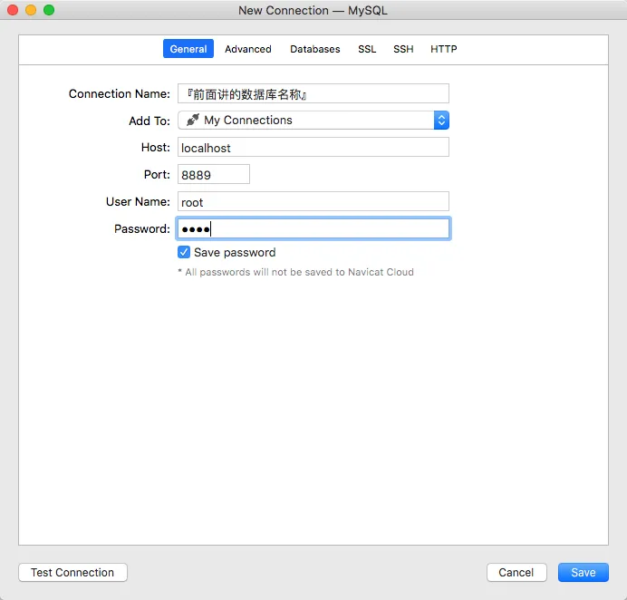 这里的名称就是__数据库名称__ host地方本地,如果是远程的话,填写ip或者url