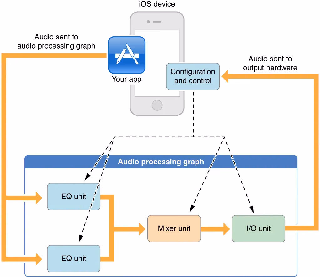 audio processing graph: A representation of a signal chain comprising an interconnection of audio units. Also called an AUGraph or graph. Core Audio represents such an interconnected network as a software object of typeAUGraph. Audio processing graphs must end in an output unit. See also audio unit.