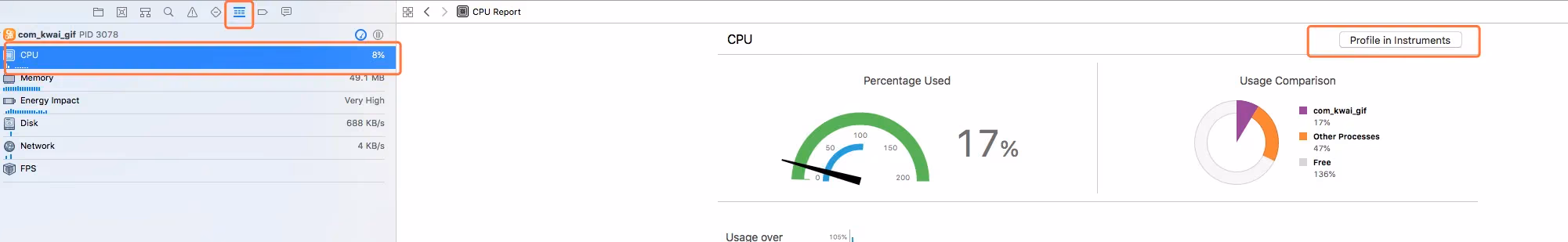 首先点击Xcode工程中的Profile运行instruments,我这里是运行工程之后 Xcode9.4可以无缝转换到instruments