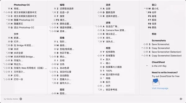 CheatSheet可以快速调出当前软件支持的快捷键,长按command即可,简单实用。