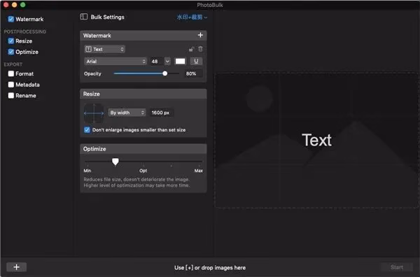 PhotoBulk可以对图片进行批量处理,比如批量加水印,只要设置好了固定的水印内容、大小、位置,就可以一键生成带水印的图片,十分方便。