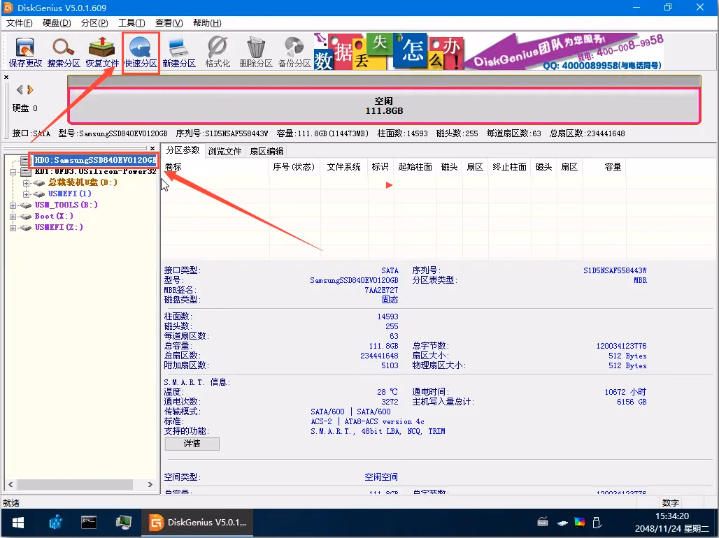 点击分区工具 之后 会看到您的硬盘 这时候 可以选择您的新硬盘之后 点击上面的快速分区 如下图
