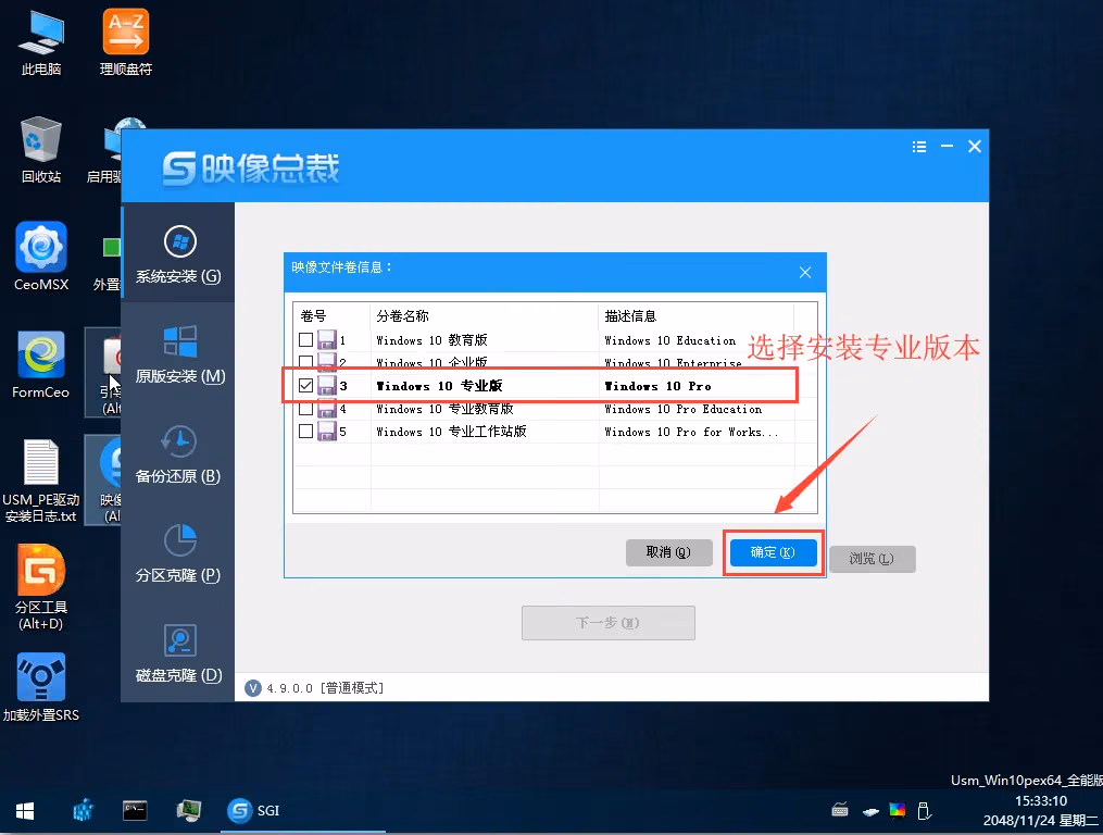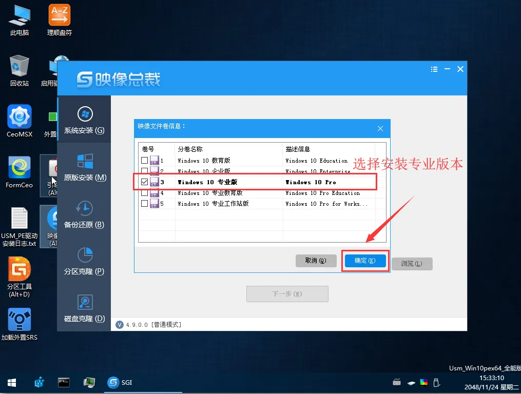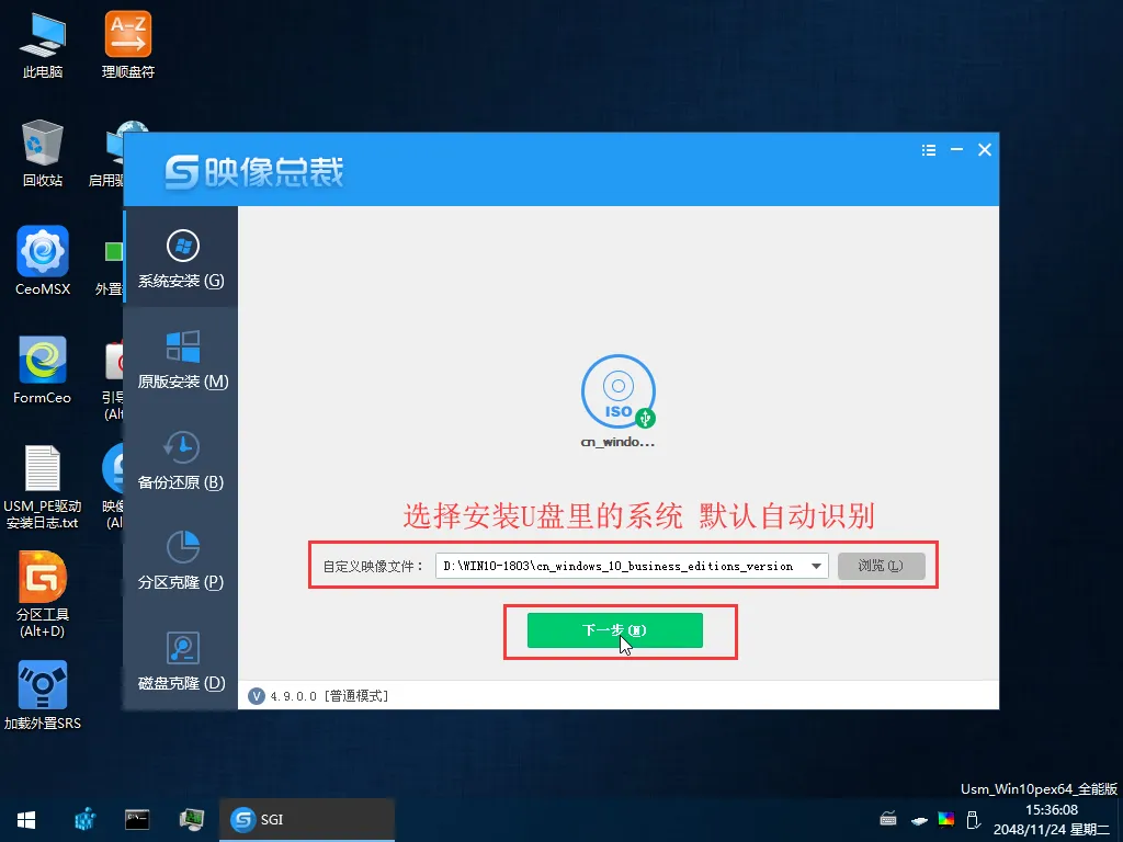 - ①选择系统镜像文件,等待自动识别和挂载后再次选择系统版本。