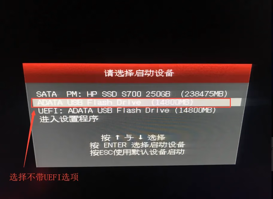 以下华硕主板快捷启动菜单选择进入U盘PE参考图,这是一个开机启动设备选项,我们选择刚刚做好的U盘 ADATA USB Flash Drlve(14800MB)按回车即可