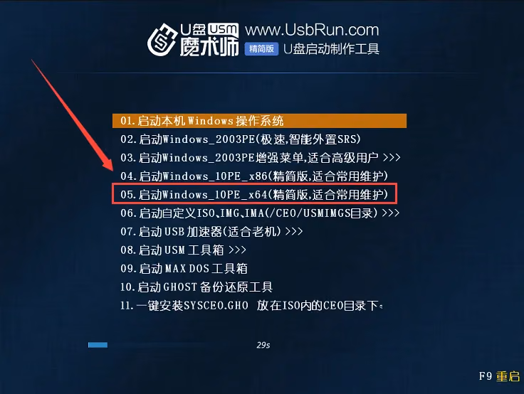 出现U盘启动界面 如下图选择 启动WIN10 PE X 64 ,别的不用去选择。