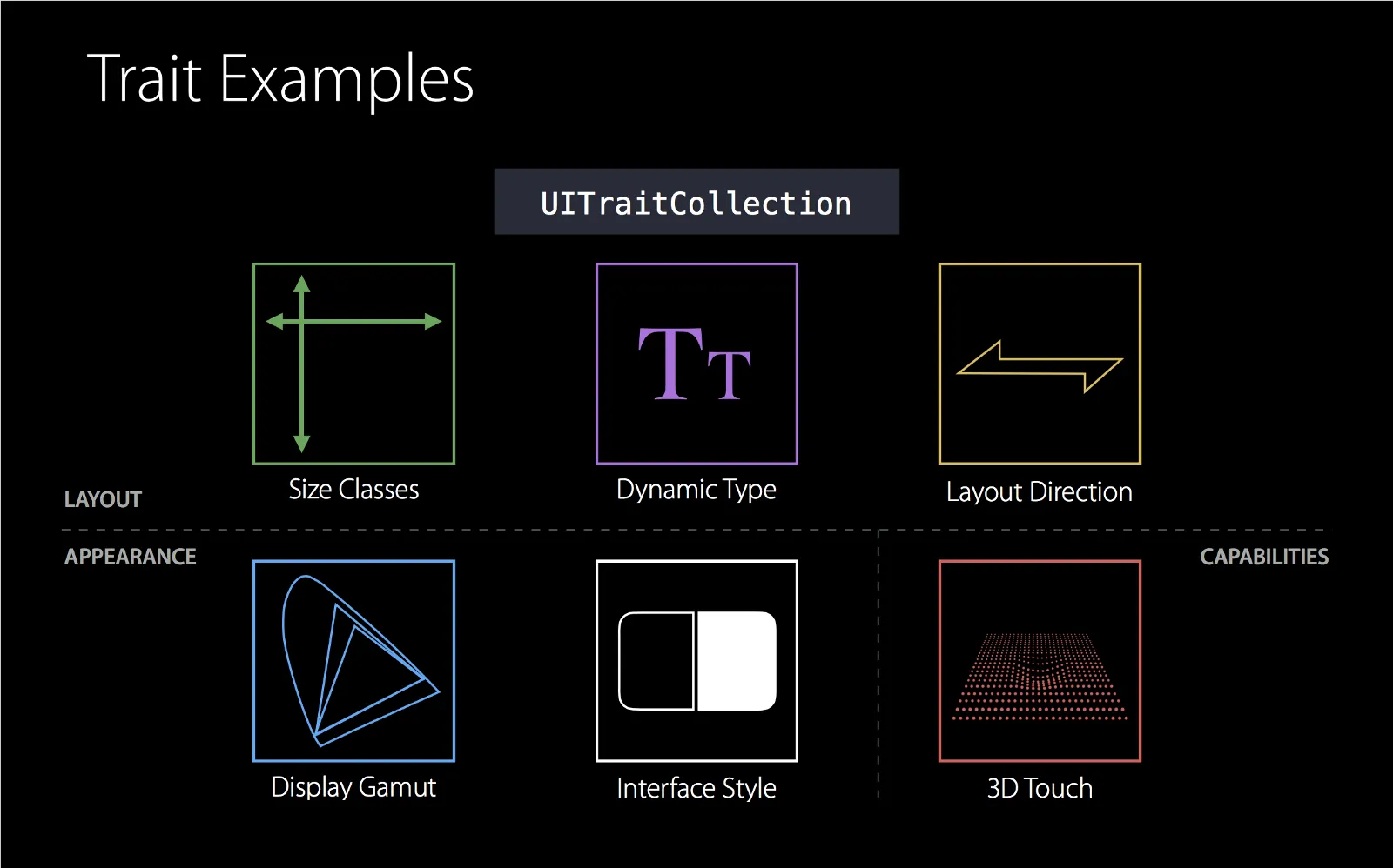 UITraitCollection本身是一个配置的集合,每个 UIView/UIViewController都有自己的 UITraitCollection对象,并将自己的UITraitCollection传递给子UIView/UIViewController作为默认值。