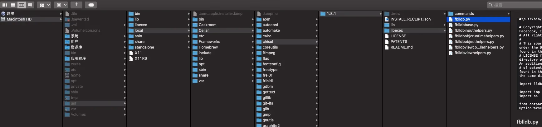 command script import /usr/local/Cellar/chisel/1.8.1/libexec/fblldb.py
