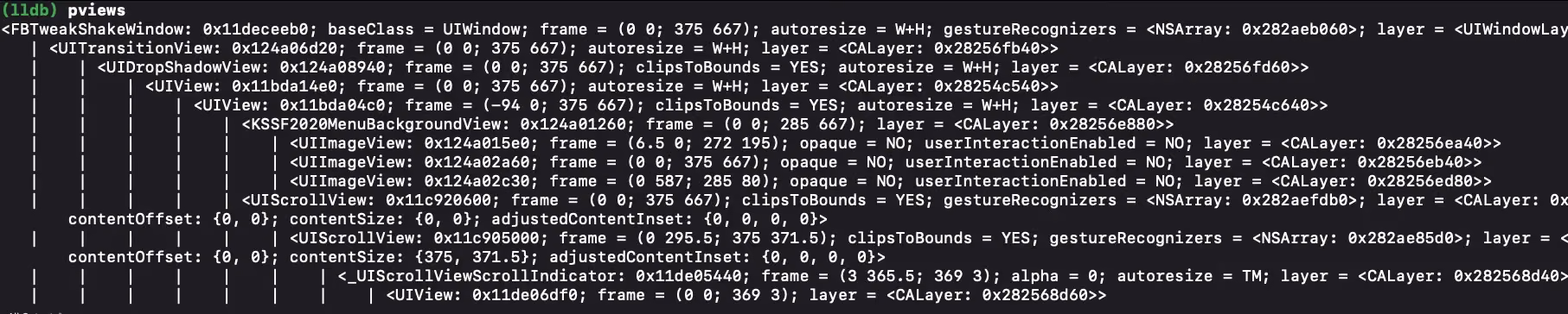 pvc:查看当前控制器状态pviews:查看UIWindow及其子视图层级关系presponder:打印一个对象的响应链关系pclass:根据内存地址打印相关信息visualize:使用mac系统preview程序查看UIImage、CGImage、UIView、CALayer、NSData(of an UIImage)、UIColor、CIColor。show/hide:显示or隐藏一个UIViewmask/umask:给一个UIView或CALayer添加一个半透明蒙版border/unborder:给指定的UIView或CALayer添加边框或移除边框用于调试,记得执行后紧接着执行caflushcaflush:刷新界面UI,类似于前面介绍的flushbmessage:添加一个断点,即使这个函数在子类没有实现(比如说在UIViewController中想在viewWillAppear中打断点,但是很可能没有实现父类方法,就可以通过bmessage [UIViewController viewWillAppear:]添加)wivar:相当于kvo,监听一个变量,例如wivar self _subviewstaplog:开启点击log功能,当点击某个控件时会打印相关控件的信息paltrace: 打印指定view的自动布局信息,比如:paltrace self.viewptv:打印当前界面中的UITableView,相对应的还有pcells打印当前界面中的UITableViewCellpdata:Data的string解码vs:搜索指定的view并加上半透明蒙版(包含子命令),例如:vs 0x13a9efe00 就可以标注出对应的控件slowanim/unslowanim:降低(或取消)动画速度,默认0.1 ,可以在任意断点或Xcode暂定执行slowanim即可,方便动画调试