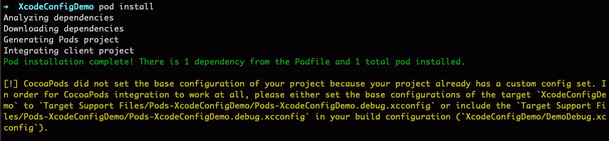 [!] CocoaPods did not set the base configuration of your project because your project already has a custom config set. In order for CocoaPods integration to work at all, please either set the base configurations of the target `XcodeConfigDemo` to `Target Support Files/Pods-XcodeConfigDemo/Pods-XcodeConfigDemo.debug.xcconfig` or include the `Target Support Files/Pods-XcodeConfigDemo/Pods-XcodeConfigDemo.debug.xcconfig` in your build configuration (`XcodeConfigDemo/DemoDebug.xcconfig`).