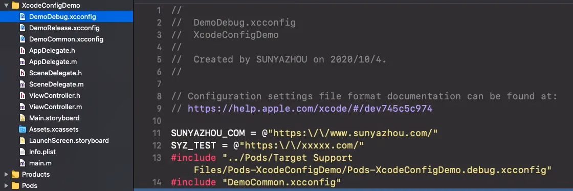 这里我加了一个通用的 DemoCommon.xcconfig 配置,为了向外输出公共的宏变量.