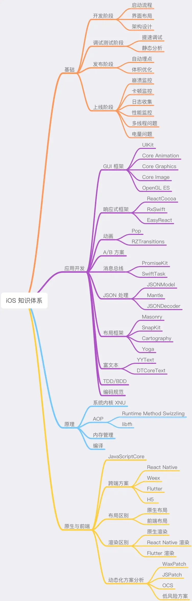 iOS 开发者需要掌握的整个基础知识,按照 App 的开发流程(开发、调试测试、发布、上线)进行了划分,如下图所示: