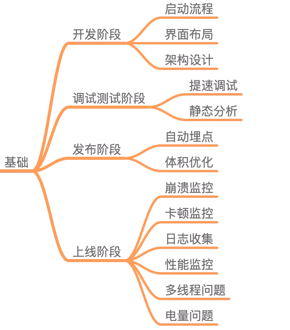 iOS 开发者需要掌握的整个基础知识,按照 App 的开发流程(开发、调试测试、发布、上线)进行了划分,如下图所示: