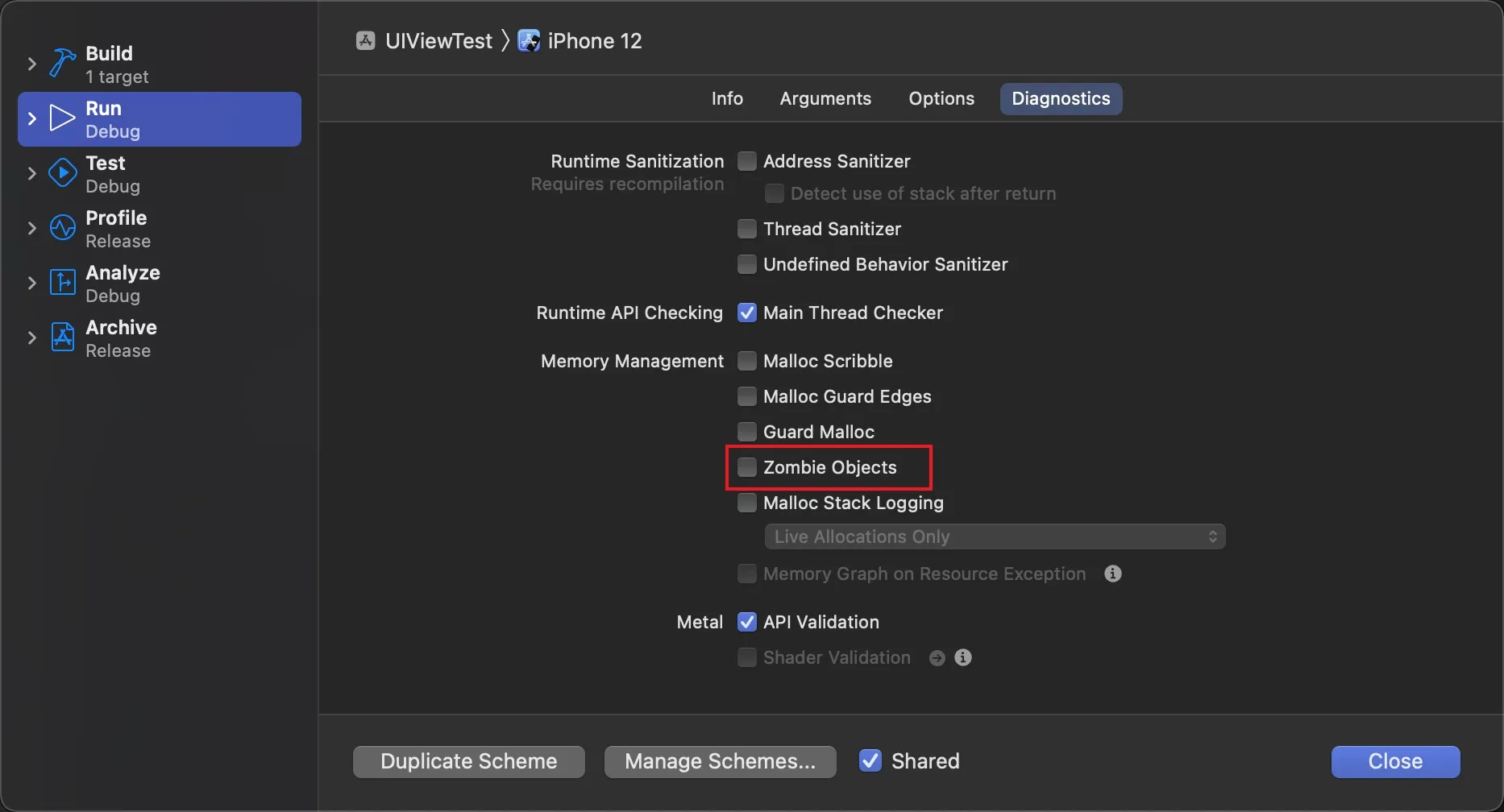 所以,当在应用中启用NSZombie而不是让应用直接崩溃时,一个错误的内存访问就会变成一条无法识别的消息发送给僵尸对象。僵尸对象会显示接收到的消息,然后跳入调试器,这样你就可以查看到底哪时出了问题。 可以在Xcode的scheme页面中设置NSZombieEnabled环境变量。点击Product的Edit Scheme打开该页面,然后勾选Enable Zombie Objects复选框,如图所示: