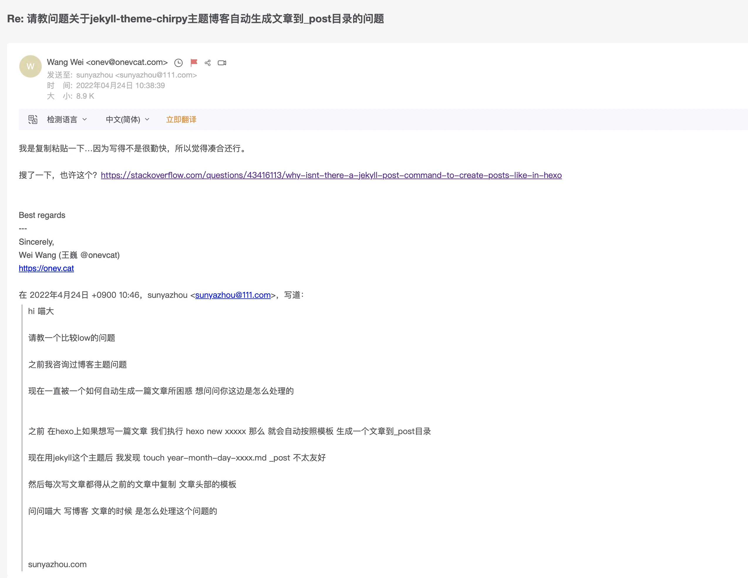 喵神不但回复了我并表示 他不是很经常写文章,这种操作他都是复制一下原来的也不麻烦.邮件末尾喵神给出来一个非常实用的 stackoverflow的答案.