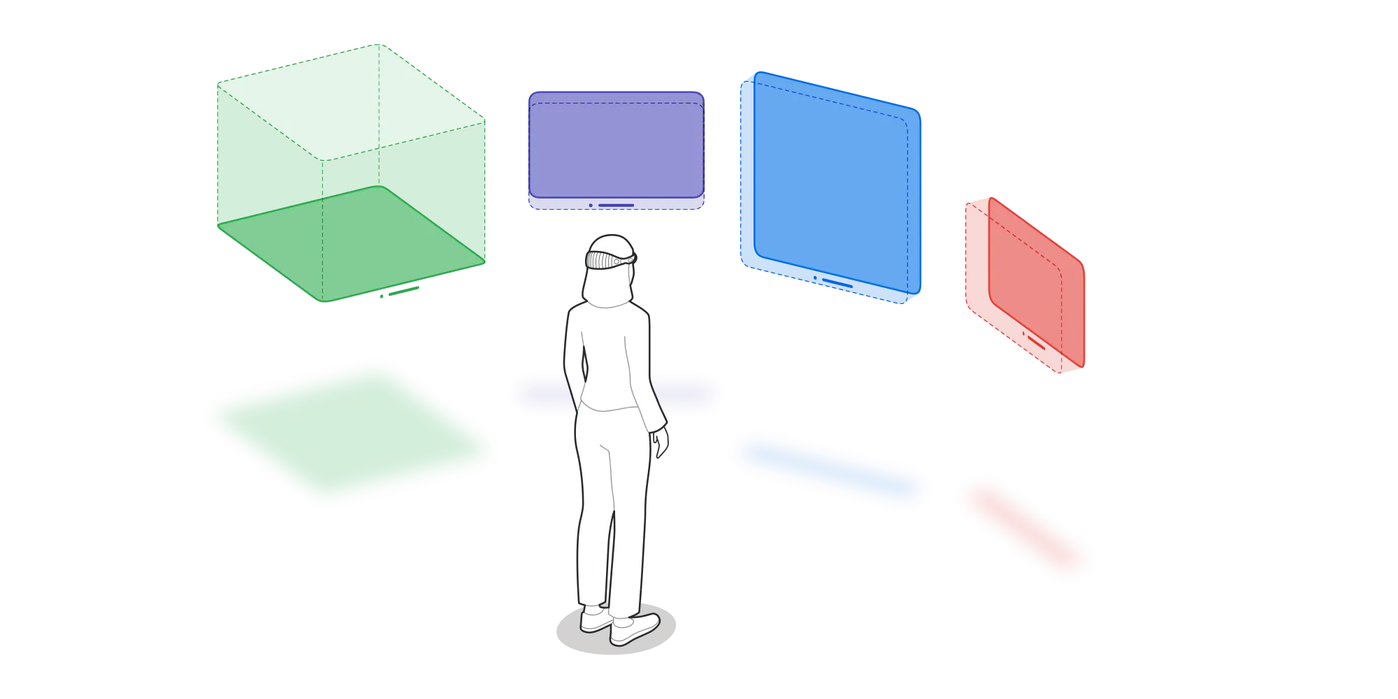 - spaces 默认情况下,应用程序启动到共享空间,它们并排存在,就像Mac桌面上的多个应用程序一样。应用程序可以使用窗口和卷来显示内容,用户可以在他们喜欢的任何地方重新定位这些元素。为了获得更身临其境的体验,应用程序可以打开一个专门的Full Space,只显示该应用程序的内容。在Full Space中,应用程序可以使用窗口和卷,创建无限的3D内容,打开通往不同世界的门户,甚至让人完全沉浸在一个环境中。
