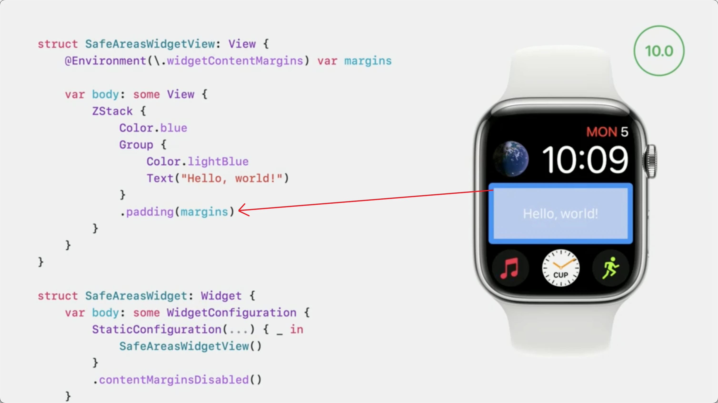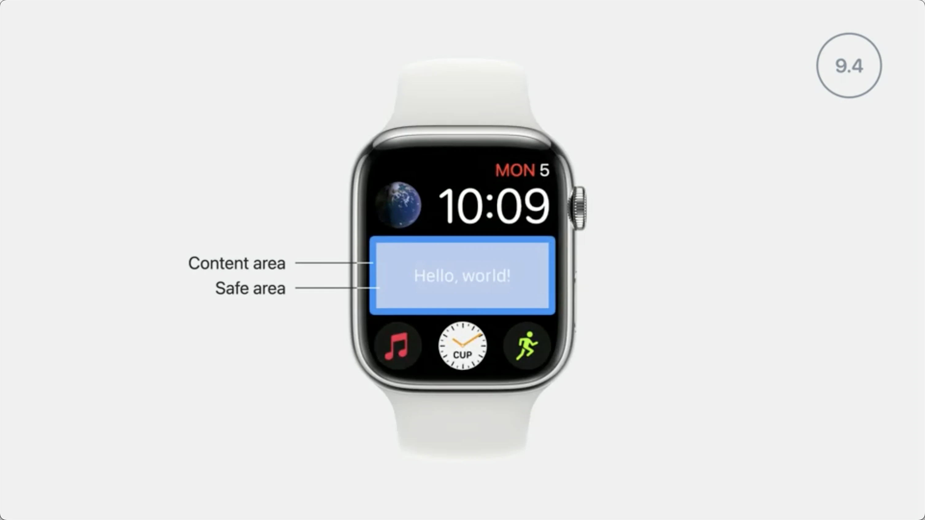 - watchOS9 and below: 使用了system-defined 的 safe area 以避免小组件太贴边。但开发者可以通过