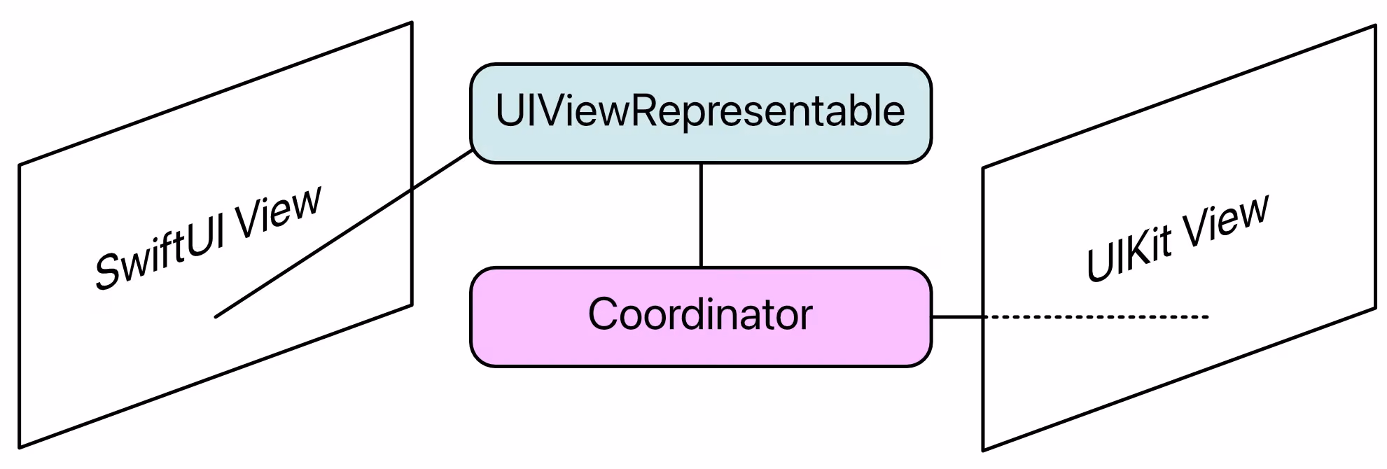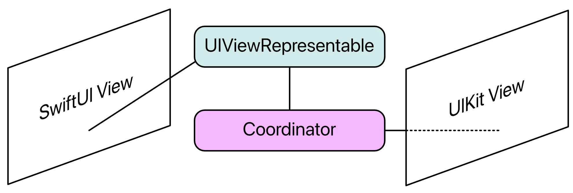 makeUIView中,你可能会设置 UIKit 视图的一些属性或事件监听器,这些监听器可以指向协调器中的方法。这样,当 UIKit 视图中的事件发生时(如按钮点击),相应的协调器方法就会被调用。