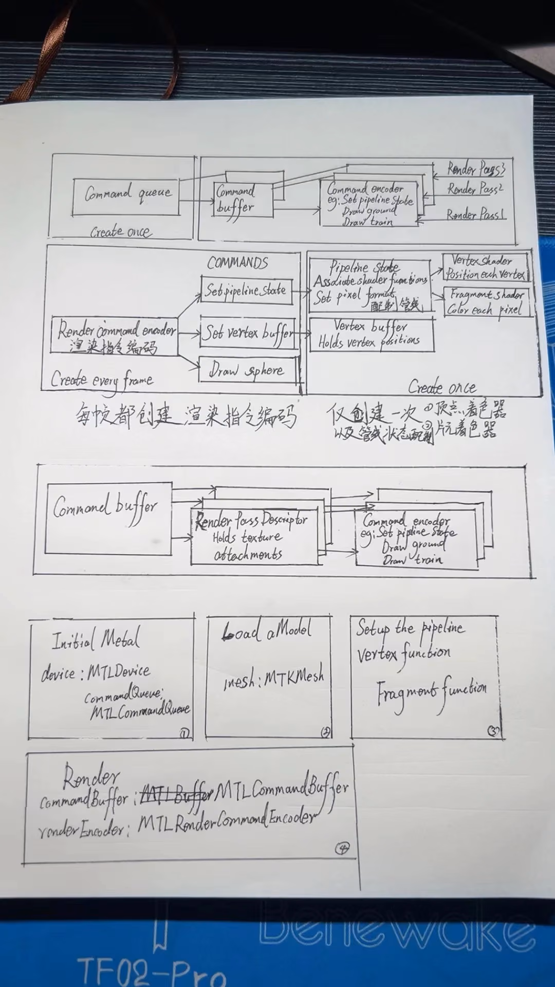 为了弄清楚Metal提供的API,我尝试写了几篇纸,弄清楚 queu、command buffer、 command encoder、pipeline buffer object…