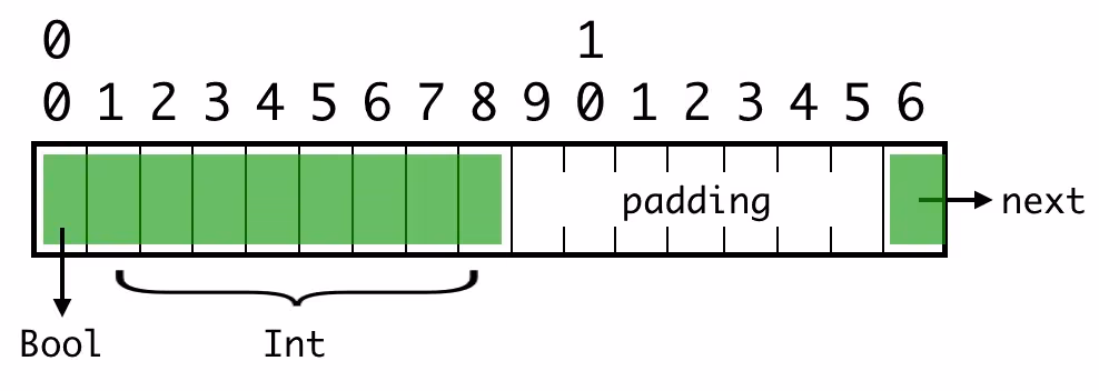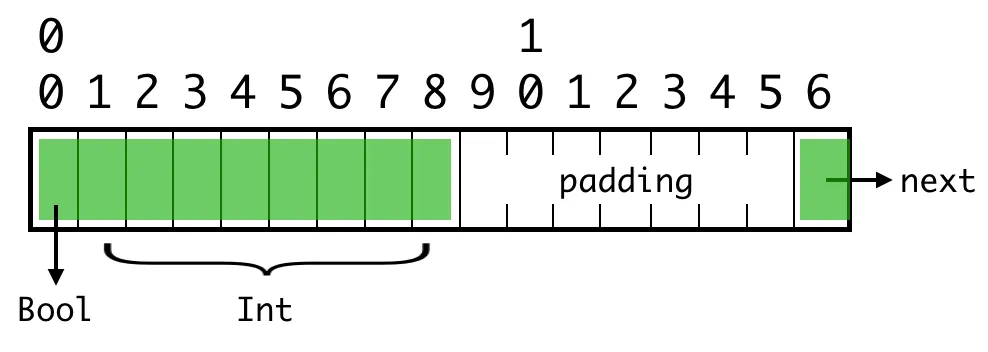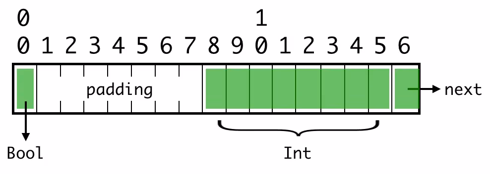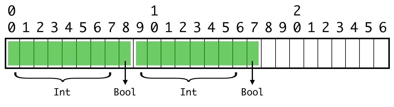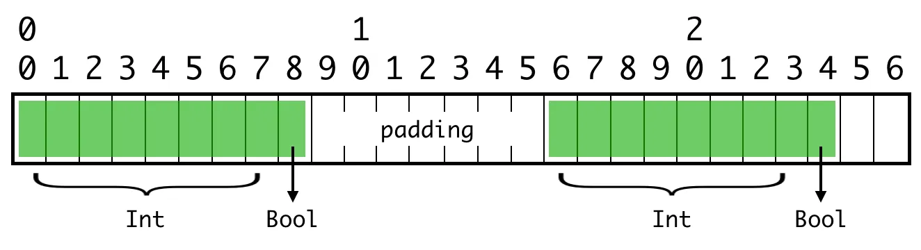 Bool 值的位置没有问题,因为它们的对齐值为 1 (alignment=1)。但第二个整数是对齐不当的。它是一个 64 位(8 字节)的值,对齐值为 8(alignment=8),而它的字节位置不是 8 的倍数。❌