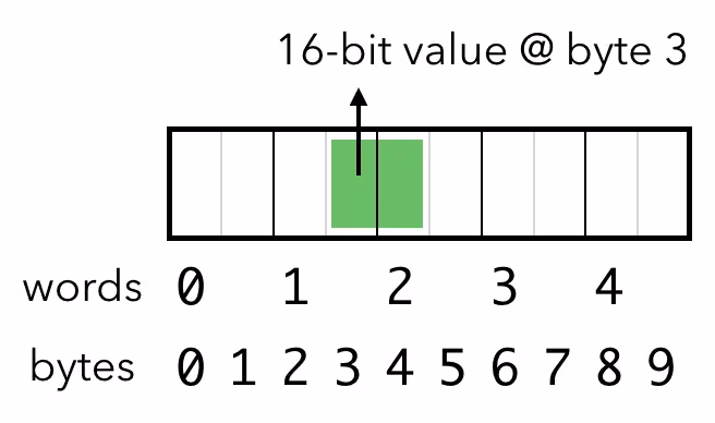 然后你升级到了一台 16 位计算机,它以 16 位的字(word)为单位访问数据。你仍然有一些旧的软件希望以字节为单位访问数据,但想象一下这里可能发生的魔法:如果软件请求字节 0 和字节 1,计算机现在可以一次性访问字 0,然后将 16 位的结果拆分。