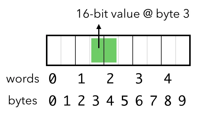 然后你要求计算机从字节位置 3 读取 16 位的字(word)。问题在于,这个值是对齐不当的。为了读取它,计算机需要读取位置 1 的字,将其切半,再读取位置 2 的字,将其切半,然后将两半拼接在一起。这意味着访问一个 16 位的值需要两次独立的 16 位内存读取——比应有的速度慢了两倍!😭