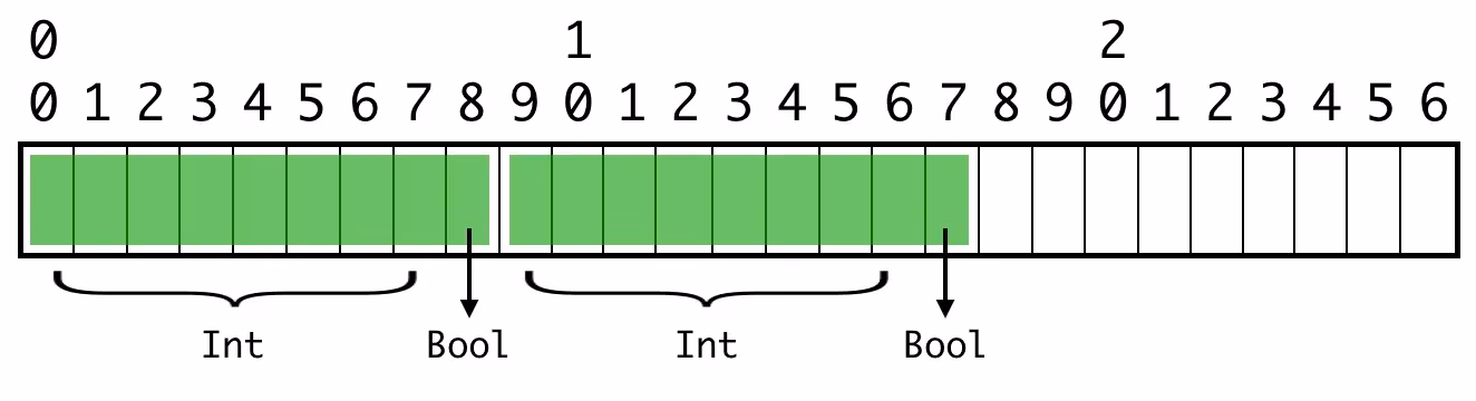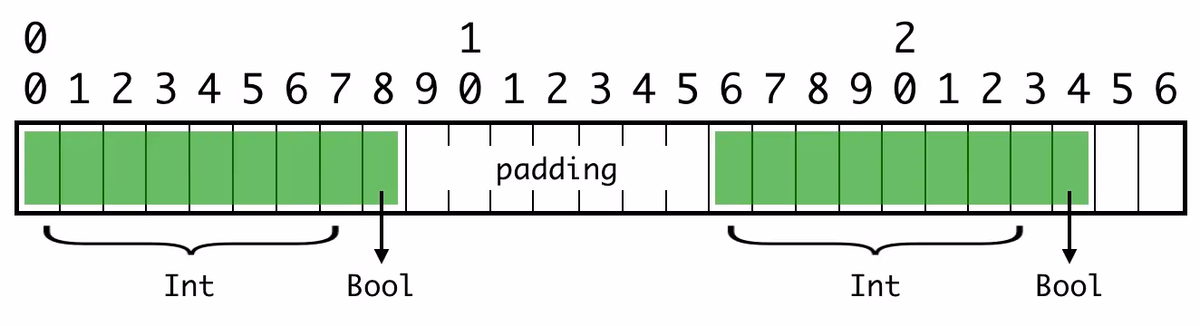 现在回到我们的 Puppy 结构体,它有一个 Int 和一个 Bool 属性。再次考虑值在缓冲区中紧挨在一起的情况: