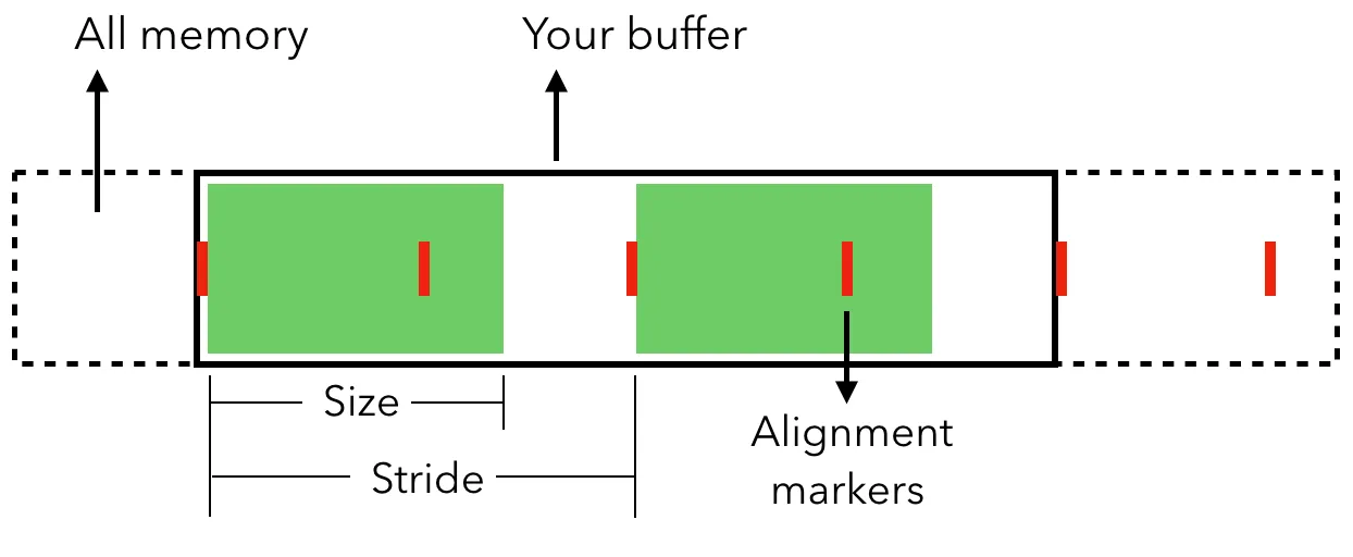 - 对齐方式(Alignment):是每个实例必须位于的“能被整除的”数字。如果你正在分配内存以复制数据,你需要指定正确的对齐方式(例如: