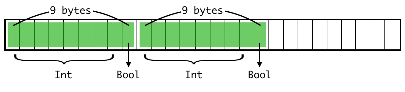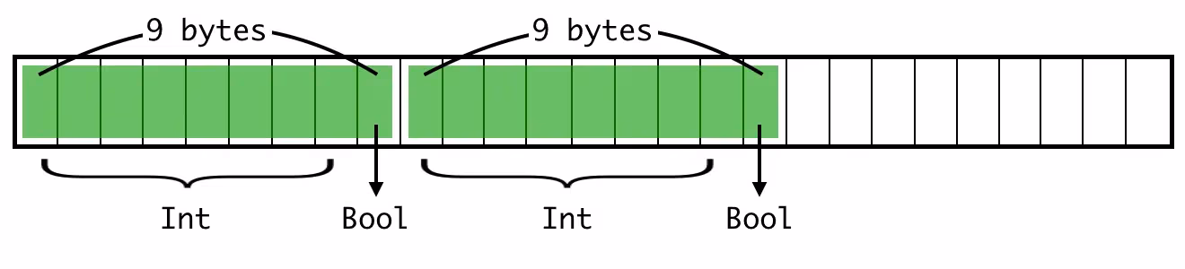 什么?!我们只是改变了属性的顺序。为什么现在大小不一样了?它应该仍然是9,不是吗?一个布尔值后面跟着一个整数,就像这样: